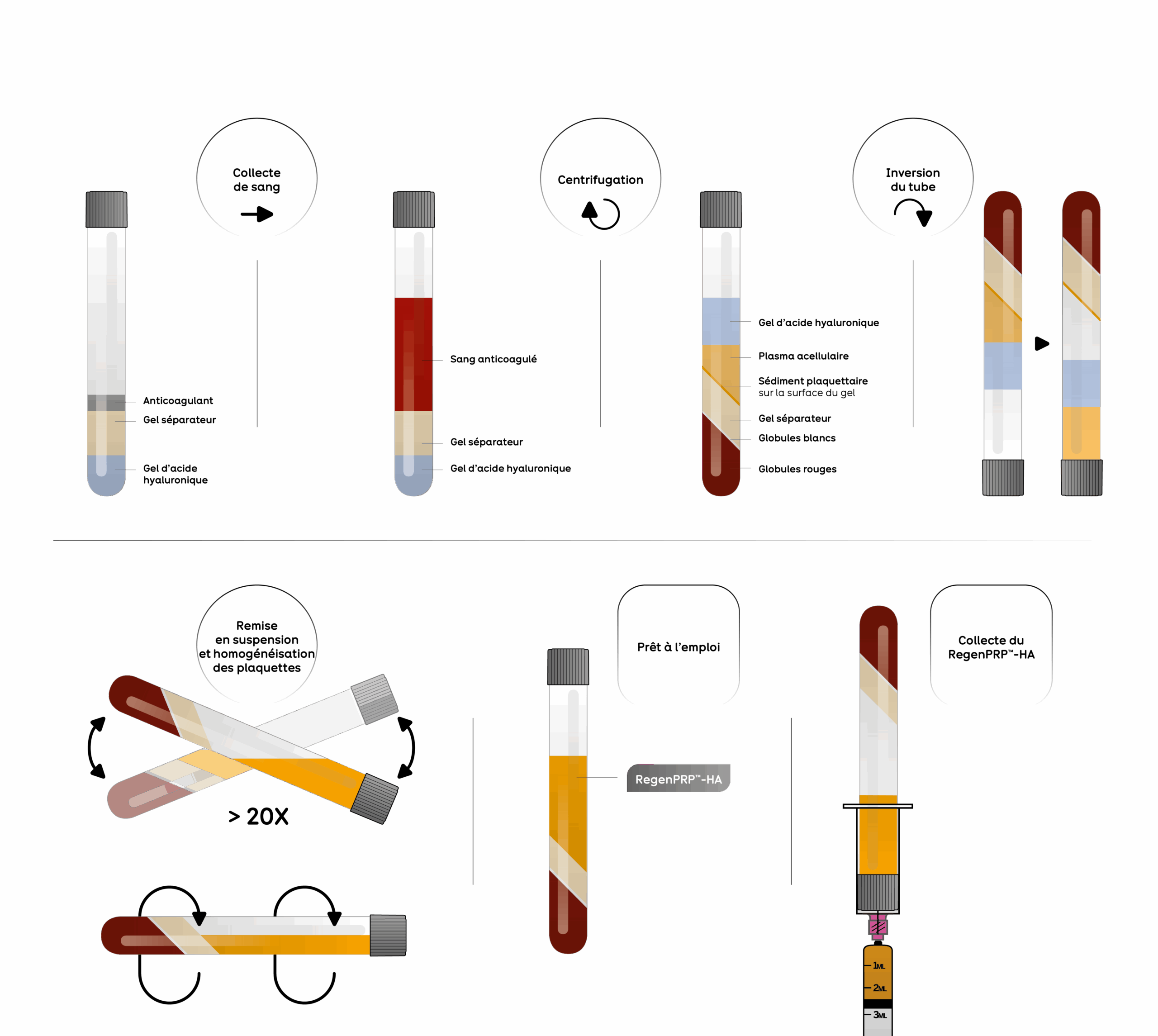 Les tubes Cellular Matrix permettent la préparation de plasma riche en plaquettes autologues (RegenPRP™) combiné à de l’acide hyaluronique non réticulé dans un système fermé.